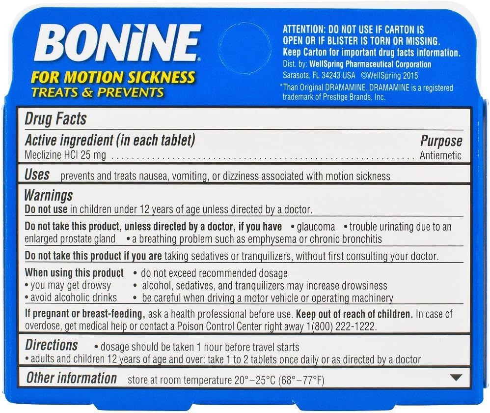 Find quality health products to add to your shopping list . The best remedy for motion sickness is bonine. Fast delivery to your home or office. Find quality health products to add to your shopping list or . Bonine, the once daily travel tablet, helps prevent dizziness, nausea and vomiting associated with motion sickness so you can travel with confidence.